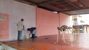 A cargo del equipo de Obras Públicas, se desarrollaron diversas tareas “es un trabajo de manera conjunta entre el municipio y las autoridades de la escuela, hicimos pintura de los portones, el mástil, aprovechamos que pararon las lloviznas para avanzar con el sector del escenario”, contó Cristian Isasmendi.