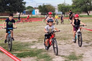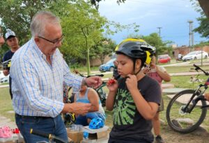 Se trata de la primera y única escuela de ciclismo de la provincia destinada a niñas y niños que están aprendiendo a andar en bicicletas y los que ya saben, pero no todos cuentan con el casco protector por eso “desde el municipio realizamos la entrega de los cascos para que cuando los chicos practiquen puedan hacerlo de manera seguro, tal como corresponde”, subrayó al tiempo que recordó “hace un par de semanas sumamos nuevas bicicletas para todos los chicos que deseen sumarse y no cuenten con una bici, lo puedan hacer”.