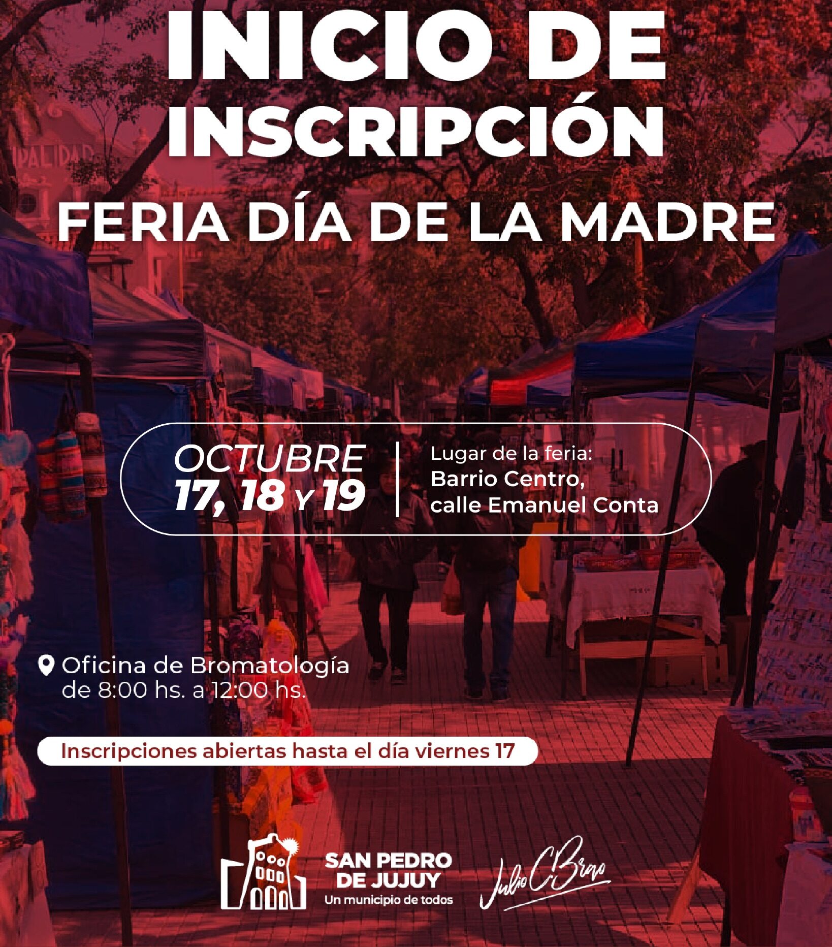 La Gestión Municipal del Intendente Julio Bravo invita a toda la comunidad a disfrutar de una nueva edición de la tradicional Feria por el Día de la Madre, que se llevará a cabo los días 17, 18 y 19 de octubre sobre Calle Conta, en Barrio Centro.