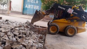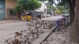 Durante este jueves, con maquinarias y personal municipal se procedió al levantamiento de paños de hormigón y de cordón cuneta dañado sobre calle Serapio Soria, casi esquina Walterio Leach. Sobre esa misma arteria, también se abrió otro frente de bacheo entre las calles Alberdi y Rogelio Leach.