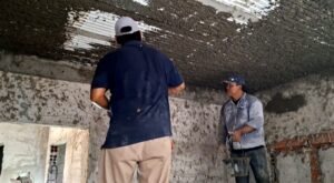 Una vez transcurrido el periodo de fraguado de  la losa para los nuevos baños, se trabaja en el revoque interior y en el sistema primario de desagües y cloacas.