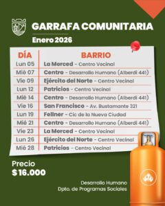 La Municipalidad de San Pedro de Jujuy, a través de la Gestión del Intendente Julio Bravo, informa a la comunidad que durante el mes de enero se llevará adelante la Venta de la Garrafa Comunitaria en los diferentes sectores barriales de la ciudad en el horario de 09:00 a 12:00, con un valor de $16.000 por familia.