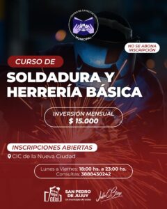 Curso de Soldadura y Herrería Básica – Enfocado en técnicas fundamentales de soldadura y trabajos en hierro, con una inversión de $15.000 por mes.